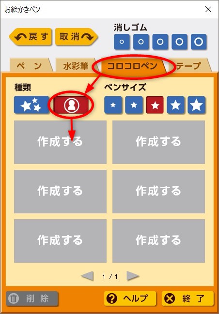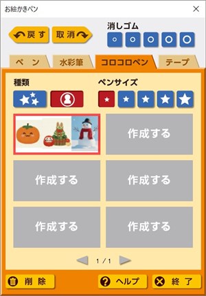 コロコロペンのデザインにも種類がありますし、ほかにも「ペン」「水彩筆」「テープ」で装飾できるようです。